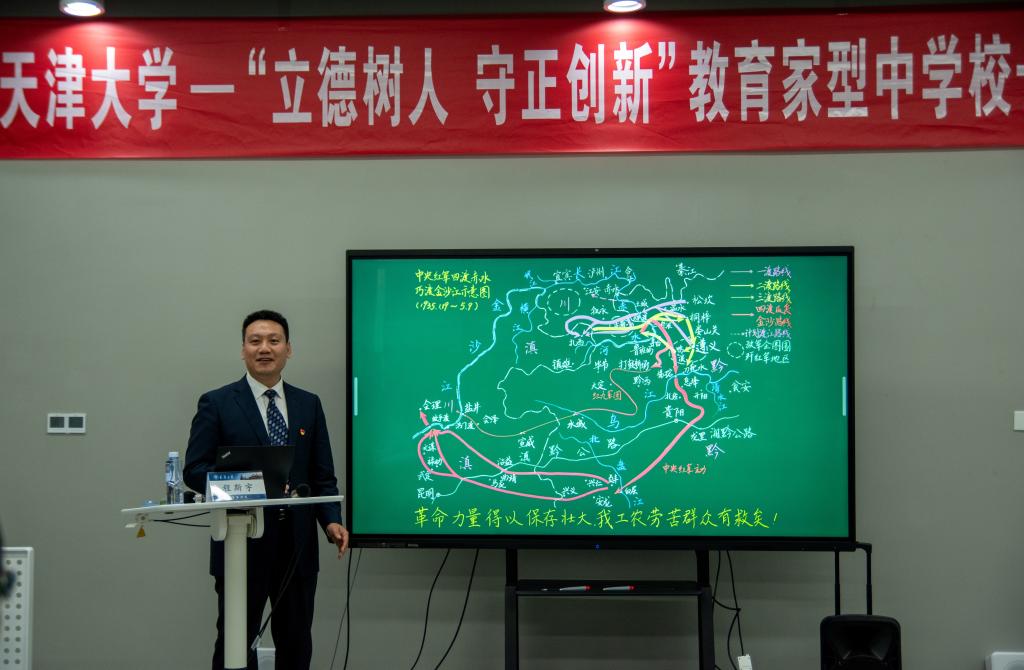 本次研修班特别邀请天津大学教育学院教授、博士生导师、职业技术教育研究所所长肖凤翔,以及天津大学马克思主义学院副教授程斯宇,为参训中学校长进行授课。肖凤翔老师以《教师专业能力发展与职业道德》为主题,以“教师四问”开场,深入讲解了如何在本职工作中成为一名出色的教育者,引起了在场校长们的深刻思考。程斯宇老师以《如何打造高精尖水平思政课:从红军四渡赤水、巧渡金沙江看中国共产党为什么能》为题,深刻解读了红军四渡赤水的历史壮举,引领学员深入思考思政教育的本质。