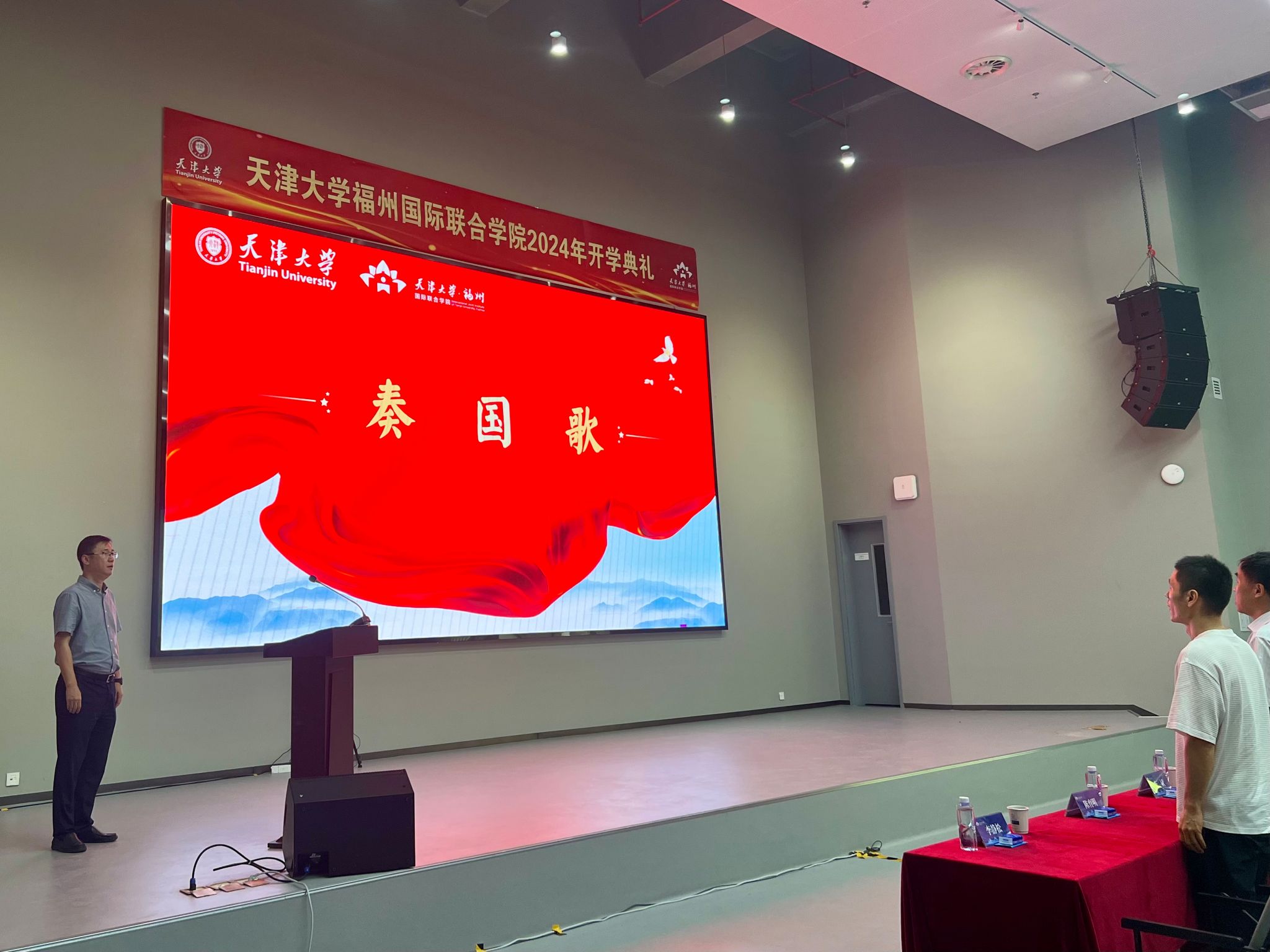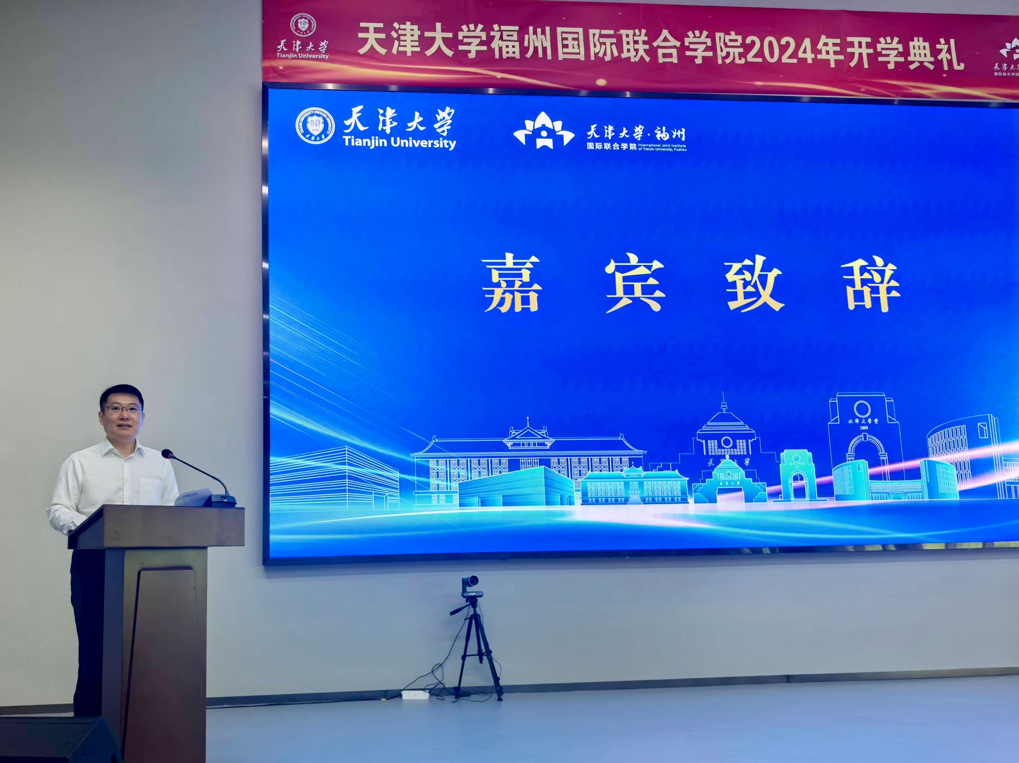 天津大学副校长明东代表学校向各位新同学致以最诚挚的欢迎。他提到,金东寒校长在天津大学2024年开学典礼上讲到“认识你自己,要将个人成长与天大品格融合交汇”。从北洋到天大,兴学强国的使命、实事求是的校训、严谨治学的校风、爱国奉献的传统和矢志创新的追求,凝聚成为“天大品格”。他指出,作为新一代天大人,同学们要继续传承“天大品格”,在天津大学福州国际联合学院开启人生新的篇章,并从“教育为本,育德为先”、“科技创新,开拓未来”、“实事求是,严谨治学”和“胸怀天下,心怀国家”这四个方面向大家寄予浓厚的期望。