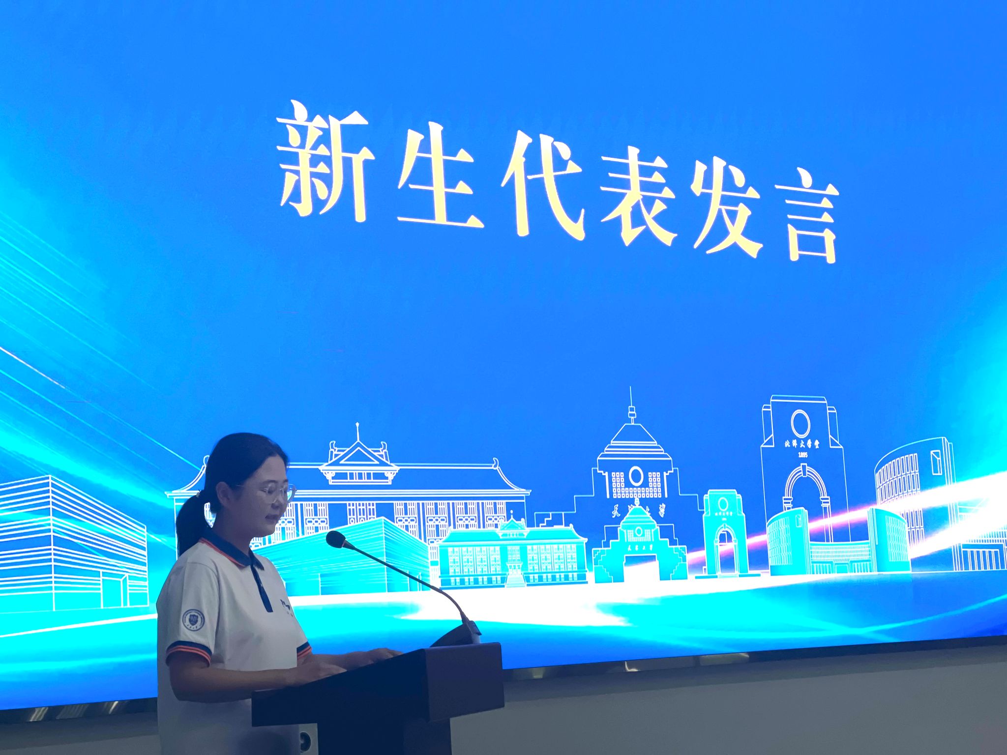 天大与新国大双硕士新生代表唐煊迪同学,福州大学城联合研究生院专项硕士、来自福建农林大学的新生代表白誉同学,福州大学城联合研究生院专项博士新生代表、福州城建设计研究院有限公司党委委员、副总经理周强同学,分别从“全新的起点”、“崭新的旅程”和“未来的规划”等方面进行了精彩的发言,不仅激励着每一位观众,更彰显了新一代研究生的风采。
