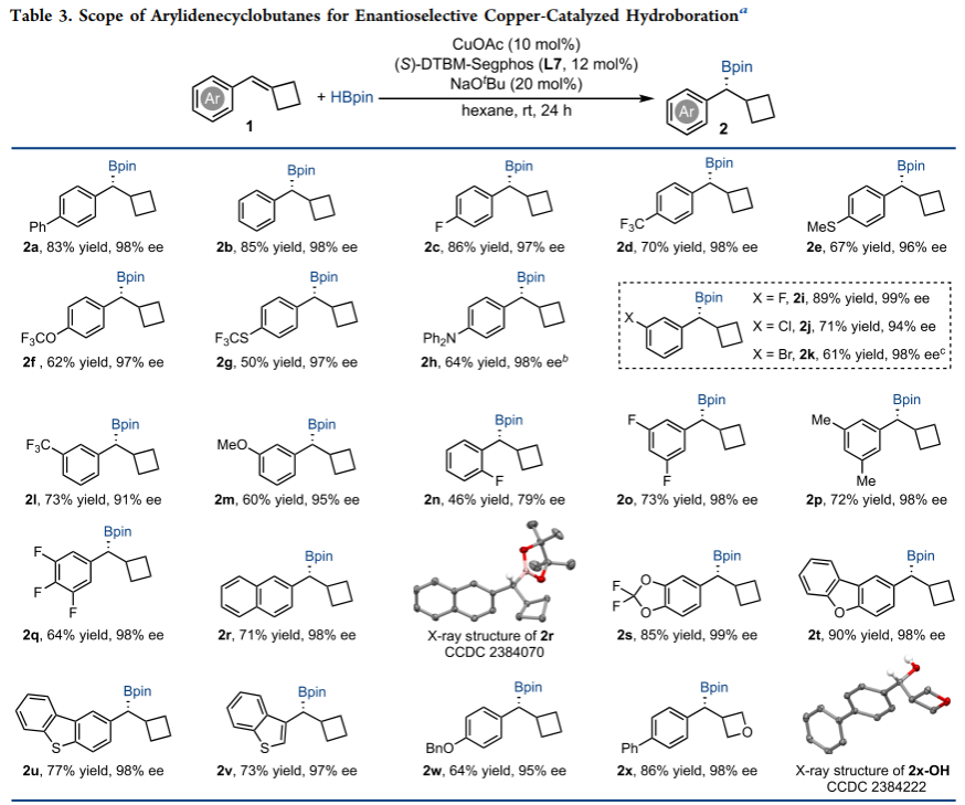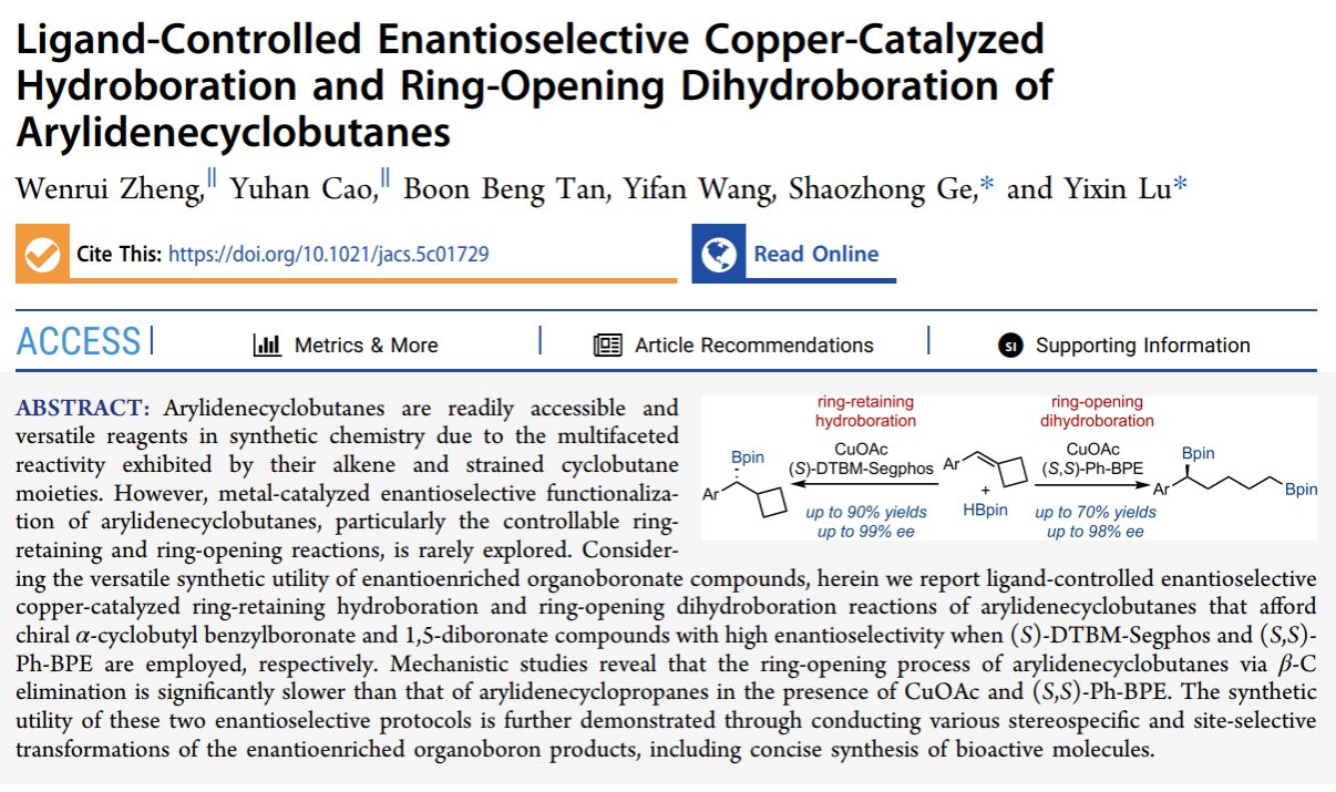 天津大学-新加坡国立大学福州联合学院为论文的第一通讯单位。天津大学-新加坡国立大学福州联合学院的博士后、天津大学理学院助理研究员郑文睿为论文第一作者,天津大学-新加坡国立大学福州联合学院的博士生曹雨涵为共同第一作者,新加坡国立大学卢一新教授与葛少中教授为论文通讯作者。(Wenrui Zheng,∥ Yuhan Cao,∥ Boon Beng Tan, Yifan Wang, Shaozhong Ge,* and Yixin Lu*Ligand-Controlled Enantioselective Copper-Catalyzed Hydroboration and Ring-Opening Dihydroboration of Arylidenecyclobutanes.J. Am. Chem. Soc. 2025, DOI:10.1021/jacs.5c01729)