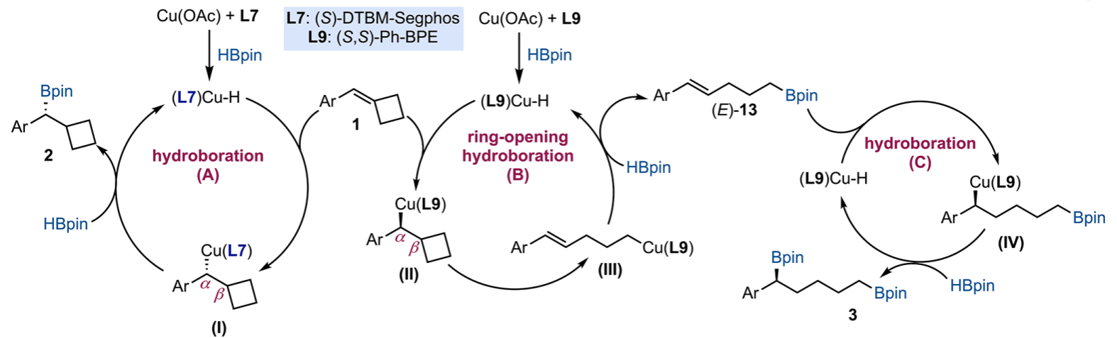 反应机理研究表明,在使用Cu/(S,S)-Ph-BPE作为催化剂时,芳基亚甲基环丁烷的开环硼氢化反应速率,远远低于相同条件下芳基亚甲基环丙烷的开环过程,且在反应体系中,仅检测到(E)式内烯烃硼酸酯作为开环双硼氢化反应的关键中间体。结合对该反应立体化学的相关研究,作者对铜催化的配体调控的芳基亚甲基环丁烷的不对称环保持与开环硼氢化提出了合理的反应机理。