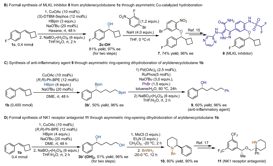 随后,作者对获得的手性α-环丁基苄基硼酸酯和1,5-二硼酸酯,分别进行了多种立体保持的具有选择性的衍生化,并利用该策略,由简单的芳基亚甲基环丁烷为原料,简洁高效的合成了具有生物活性的分子,例如抗炎药剂,或生物活性分子的关键中间体,例如MLKL抑制剂和NK1受体拮抗剂。