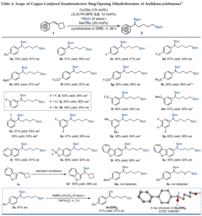 通过配体的调控作用,成功实现了铜催化的芳基亚甲基环丁烷的不对称环保持硼氢化反应,和开环双硼氢化反应,制备了一系列具有丰富合成用途的α-环丁基苄基硼酸酯和1,5-二硼酸酯类化合物。该反应为合成具有环丁烷结构的手性药物或生物活性分子提供了广泛的平台。同时,作为芳基亚烯基环丁烷的不对称开环双官能化的首例报道,该策略为开发其不对称开环官能团化反应提供了理论基础,并为获取结构复杂的1,5-双官能团化合物带来了更多选择。