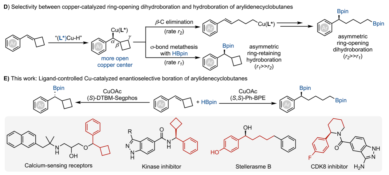芳基亚甲基环丁烷制备简单,反应位点丰富,尤其是在过渡金属催化作用下,具有潜在的多样的反应模式,是有机合成中理想的反应砌块。然而,相比于发展较为成熟的芳基亚甲基环丙烷的不对称官能团化,芳基亚甲基环丁烷参与的不对称催化反应仍非常有限,尤其是廉价过渡金属催化的不对称开环双官能团化反应,目前仍未有报道。对映体富集的手性单硼烷和多硼烷化合物,因其可进行丰富的立体保持的选择性转化,在合成化学中具有重要意义,可由它们发散性合成结构复杂的天然产物,药物分子及生物活性分子等。据此,天津大学-新加坡国立大学福州联合学院卢一新教授课题组与新加坡国立大学葛少中教授课题组合作,报道了首例配体控制的铜催化的芳基亚甲基环丁烷的不对称环保持硼氢化反应与开环双硼氢化反应,制备手性单硼酸酯与1,5-双硼酸酯类化合物,相关研究于近期发表于Journal of the American Chemical Society。