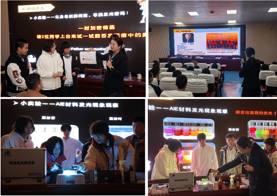 在互动体验环节,通过“小小侦探—指纹发光”“防伪标志鉴定”等环节的演示与体验,让同学们直观感受AIE发光材料在不同状态下呈现的变化与应用逻辑,体验科学从原理走向现实的过程。吴敏鼓励同学们保持科学好奇心与独立思考意识,夯实数理基础、敢于提出问题、善于动手验证,在持续探索中建立对科学方法与科研精神的理解,把个人兴趣转化为面向未来的学习动力与创新能力。