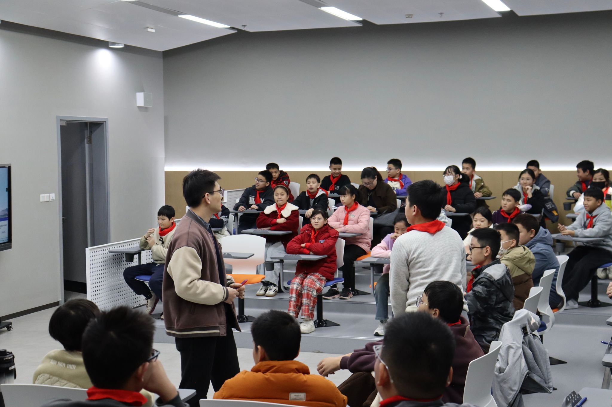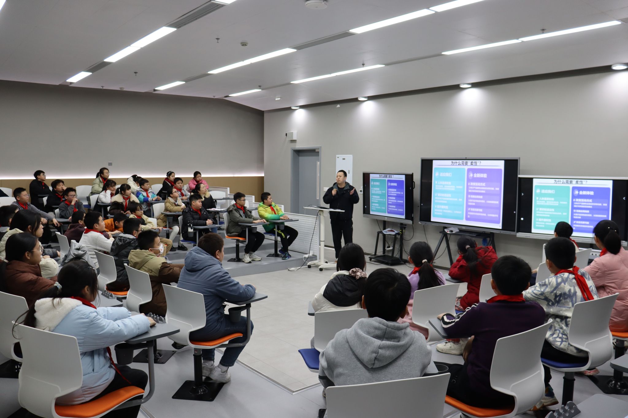 课堂上动画演示与互动问答交织。“屏幕能像纸一样弯曲?” “柔性电子能做彩色衣服、炫彩鞋子吗?”“它怎么检测人体活动?”——孩子们惊叹连连,眼中闪烁着好奇的光芒,让这场研学之旅留下了鲜活而生动的火花。