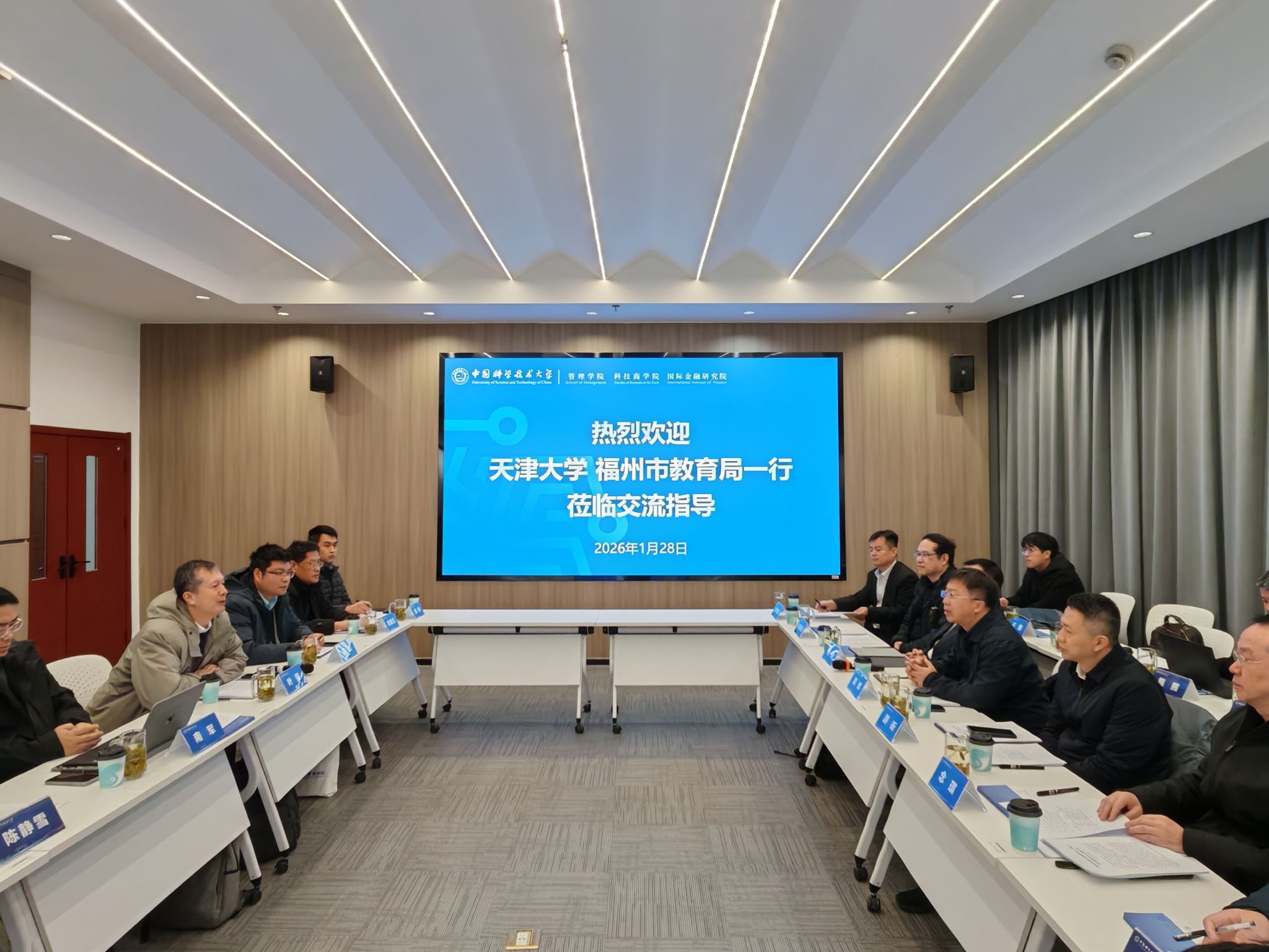 2026年1月28日,福州市委教育工委书记、市教育局局长游昕,天津大学校长助理、福州国际联合学院(以下简称福州学院)院长黄辉率队赴中国科学技术大学科技商学院(以下简称中科大科技商学院)开展调研交流。中科大科技商学院、管理学院执行院长、国际金融研究院院长叶强参与座谈。