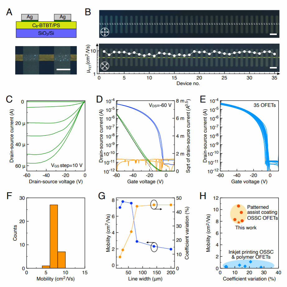 在性能方面,相关器件表现出优异的稳定性与均一性。集成制备的OFET阵列平均空穴迁移率达7.8 cm⟡V⁻¹s⁻¹,器件差异系数(CV)低至~13.1%,达到该技术领域的国际先进水平,为高性能器件规模化制备奠定了坚实基础。