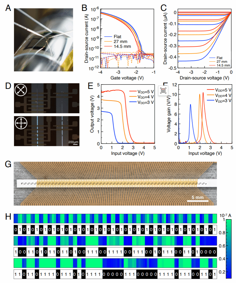 同时,该技术在柔性基底上同样展现出极佳的适配性,具备良好的可穿戴与可折叠应用潜力。研究团队进一步构建了96通道有机光电探测器阵列,成功实现了一维条形码识别功能,在光学识别与智能传感等领域展现出广阔的前景。该研究提出了一种可直接打印高性能有机半导体单晶的新策略,为柔性可扩展有机集成电子电路制造提供了新的技术路径。