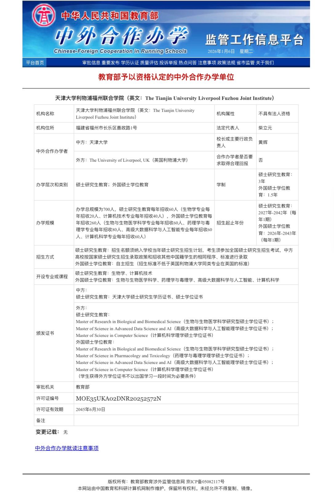 2025年12月,教育部批准设立天津大学利物浦福州联合学院(The Tianjin University Liverpool Fuzhou Joint Institute,简称天大利物浦学院)。作为福州学院下设的首个非独立法人中外合作办学机构,天大利物浦学院坚持“高起点、高标准、高质量”的办学定位,紧密对接国家战略需求和区域产业发展方向,着力培养具有国际视野与创新能力的高层次人才。先期开设生物与生物医学科学、药理学与毒理学、高级大数据科学与人工智能、计算机科学4个外国硕士学位教育(外方单证)项目,以及生物学、电子信息(计算机技术)2个硕士研究生教育(中外双证)项目,未来将逐步拓展本科层次办学,力争构建涵盖本科与硕士教育的人才培养体系。
